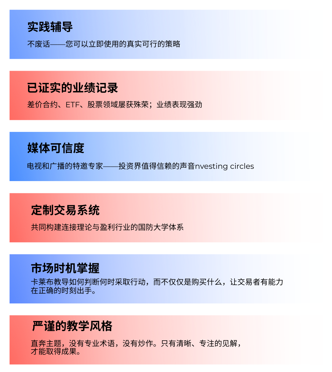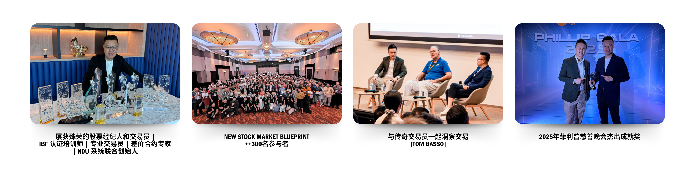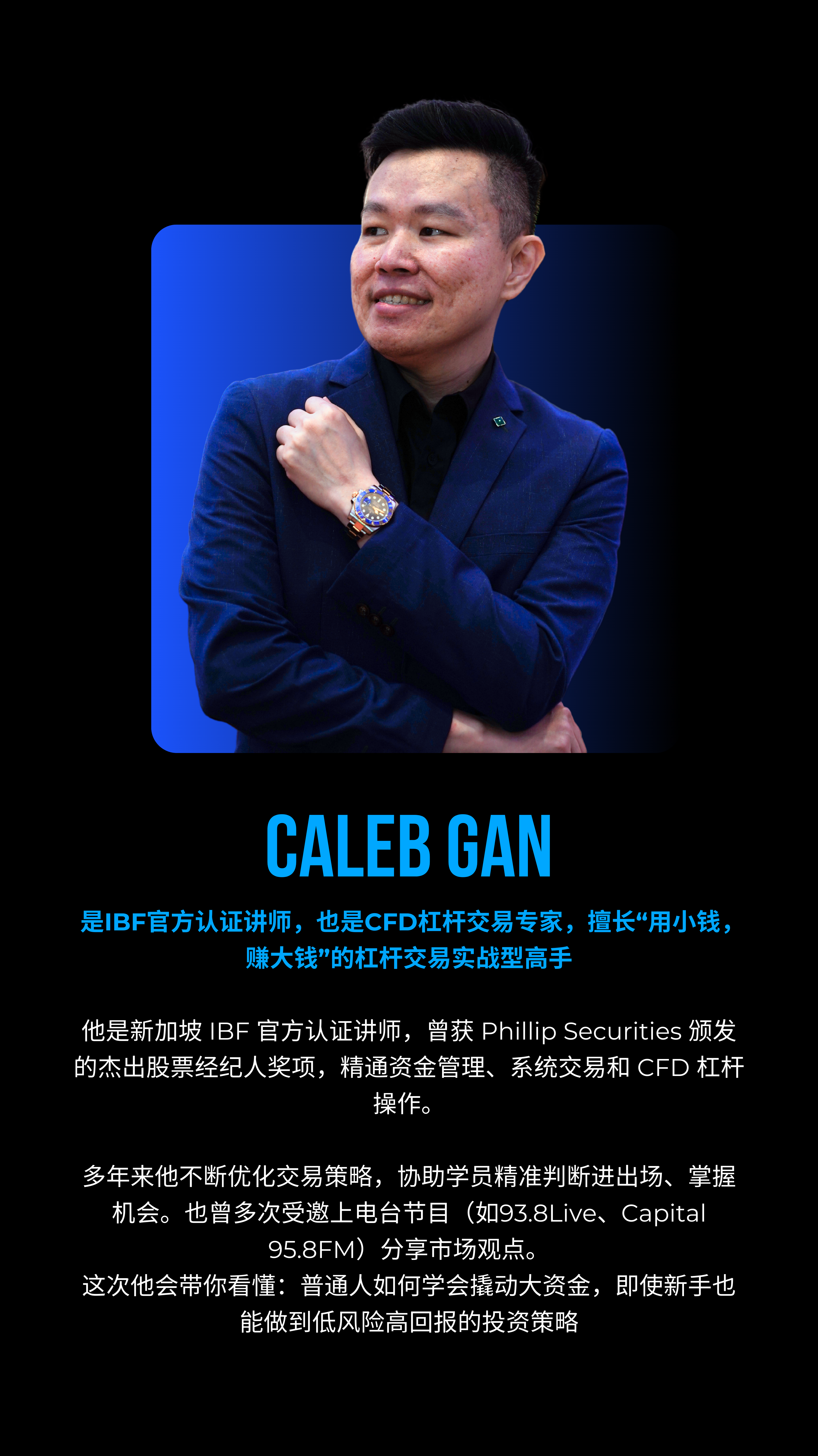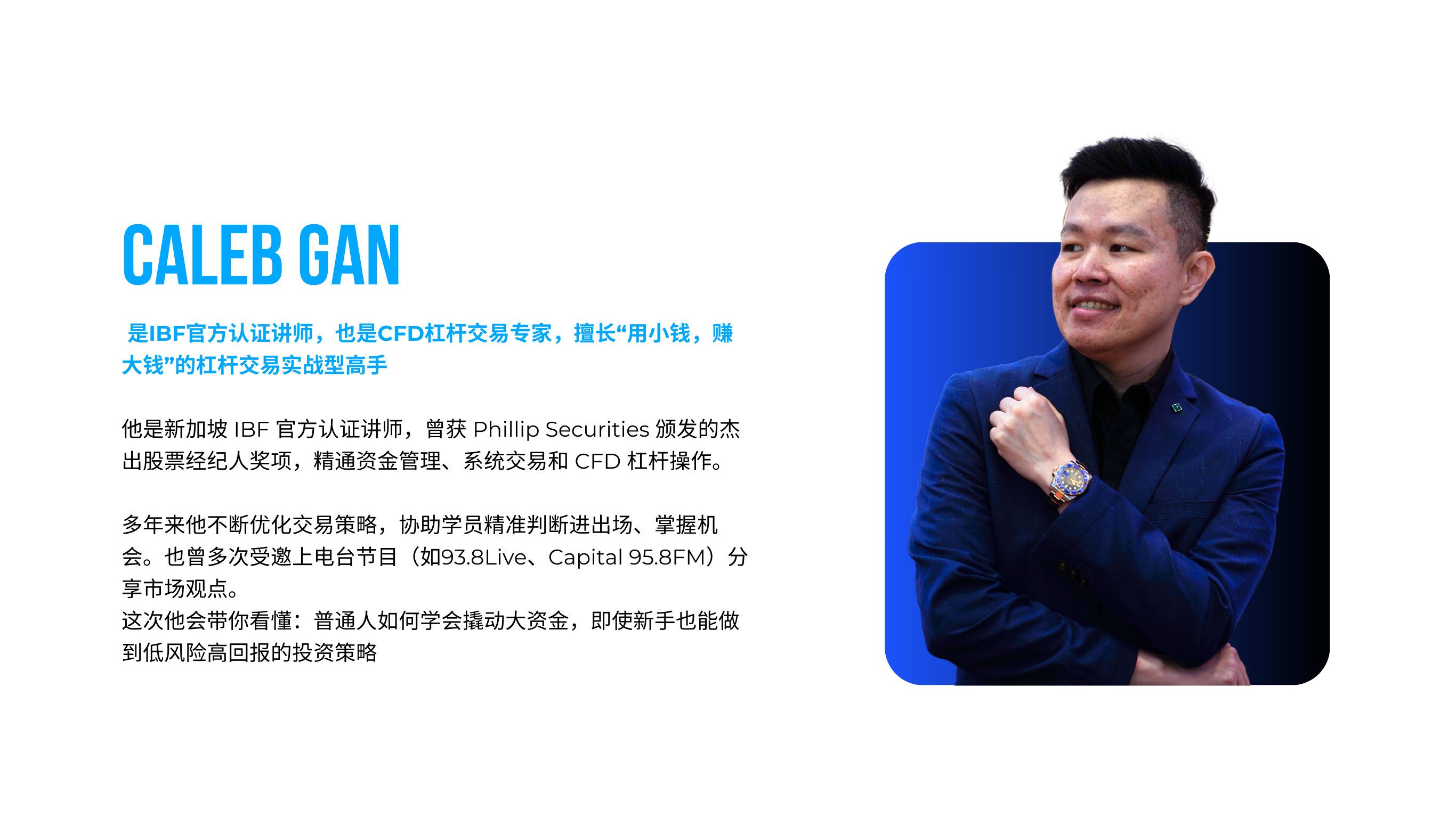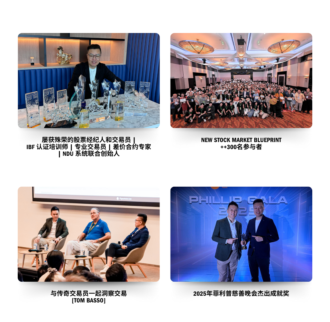 他是新加坡 IBF 官方认证讲师,曾获 Phillip Securities 颁发的杰出股票经纪人奖项,精通资金管理、系统交易和 CFD 杠杆操作。